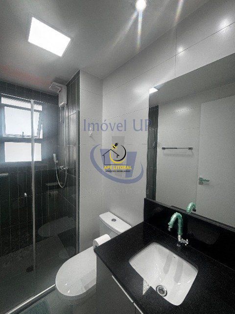 Banheiro com ventilação natural, box de vidro, espelho e armário moderno