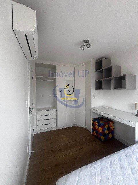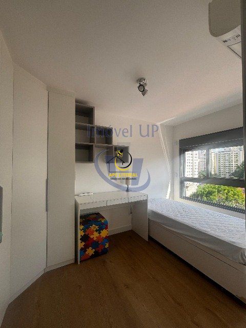 Quarto bem iluminado com janela, ar-condicionado, cama de solteiro king com baú, armários planejados e escrivaninha.